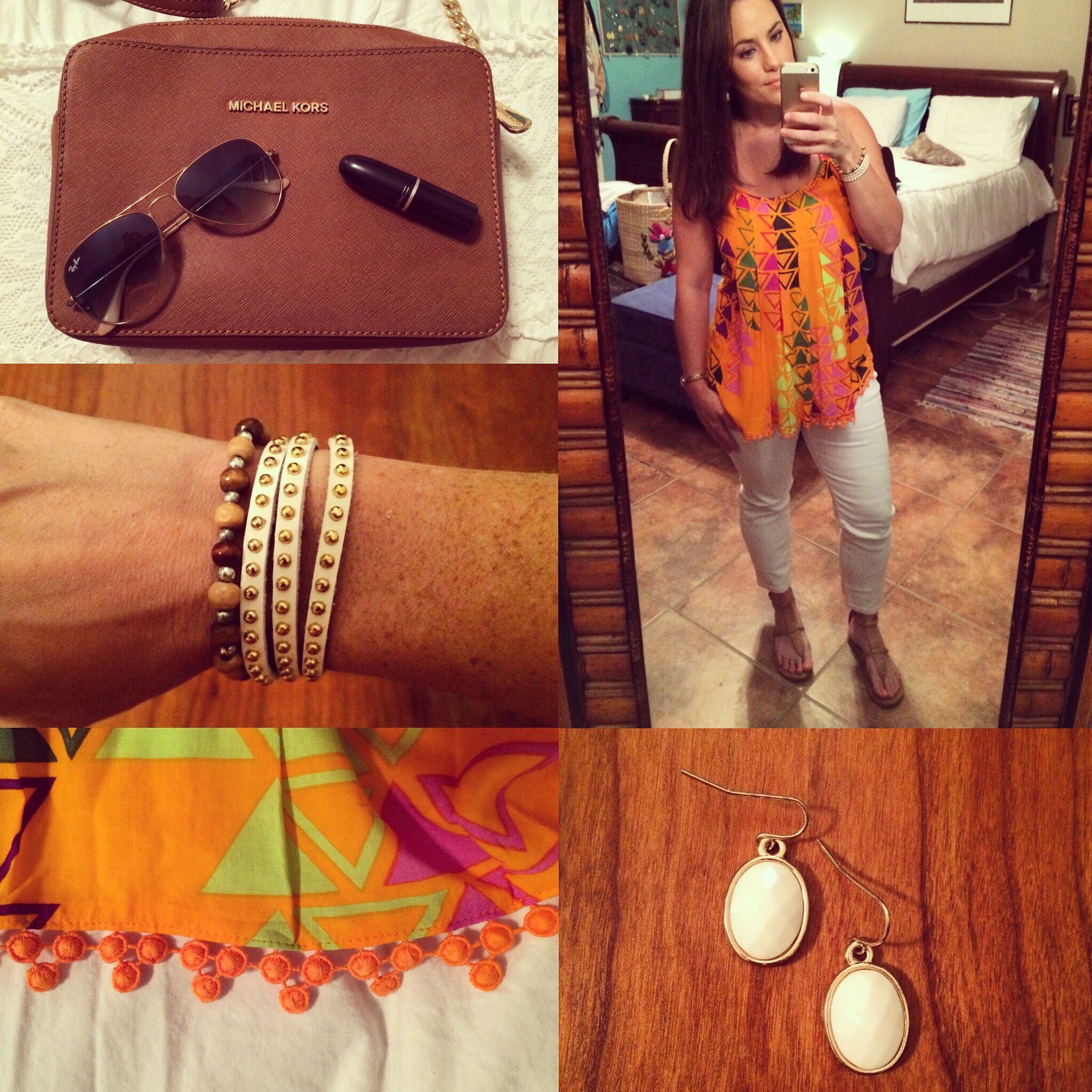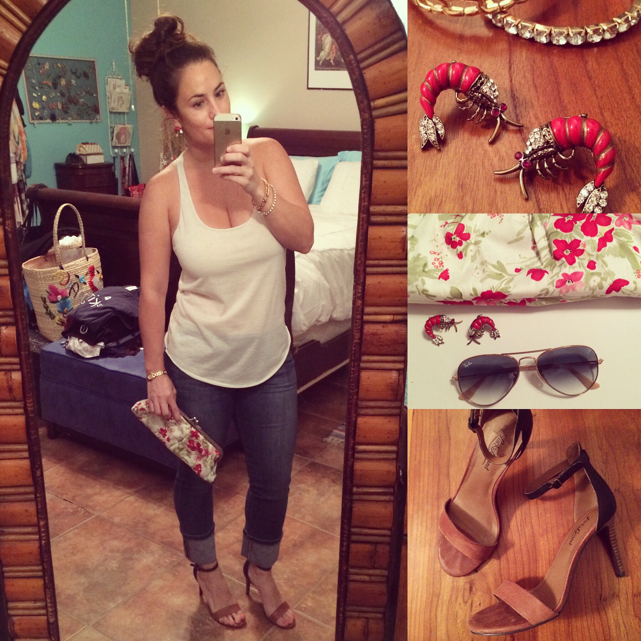 I like to dress casual and simple, but that doesn’t mean it has to be boring! These shrimp earrings (literally) add a little sass. Also, these will be my go to heels for the fall! Only $20 at the Dillard’s sale. This floral clutch was a gift many, many years ago, but it’s still a fav.