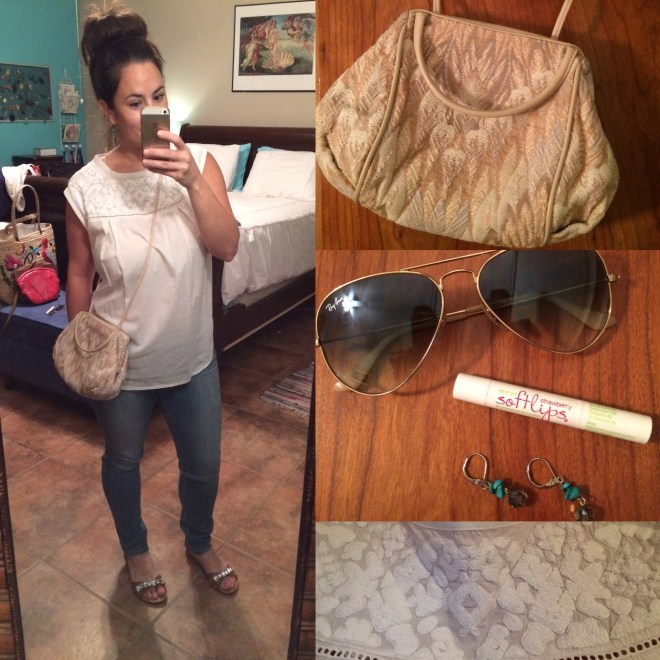 Usually embroidered clothing is brightly colored, but not this top. Yet it’s so simple and delicate, with lots of embroidery detail. It was perfect for running around earlier this morning. Some days you don’t want to make a statement or stand out and today was just that kind of day.  Btw, yesterday after the gym, Lissette and I were wandering about and came across the last day of a rummage sale and everything was 50% off. I got this vintage purse for $1.50!