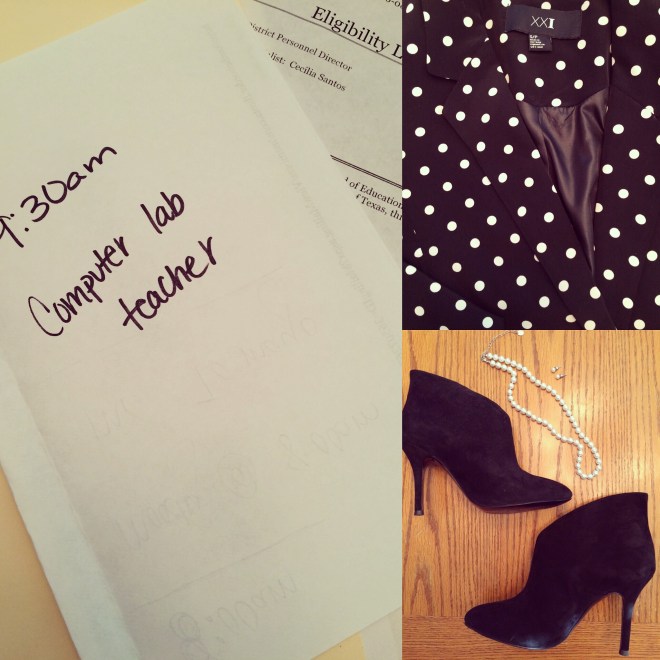 I’m no expert in this area. I was fortunate enough to land a job in finance after graduating from college. It didn’t pay much my first year, but, boy, did I learn a lot! It’s still a little strange to me how you can be expected to handle a multi-million dollar portfolio, but only get paid peanuts. Oh well, that’s water under the bridge now. And, like I said, I learned a lot. And that’s priceless. After that I became my daddy’s ‘right-hand-man,’ at the company he owns. Talk about a change of scene! I went from wearing matching skirt suits to jeans, leggings…whatever I wanted! Well, my daddy has relocated to another area of Texas and I decided to stay here. (It was a great three years!) So job hunting has been my job lately. Today I had an interview for the position of a computer lab teacher. I have a second interview tomorrow! I’ll keep ya posted! Take a peek at my simple interview outfit. Pearls and polka dots.