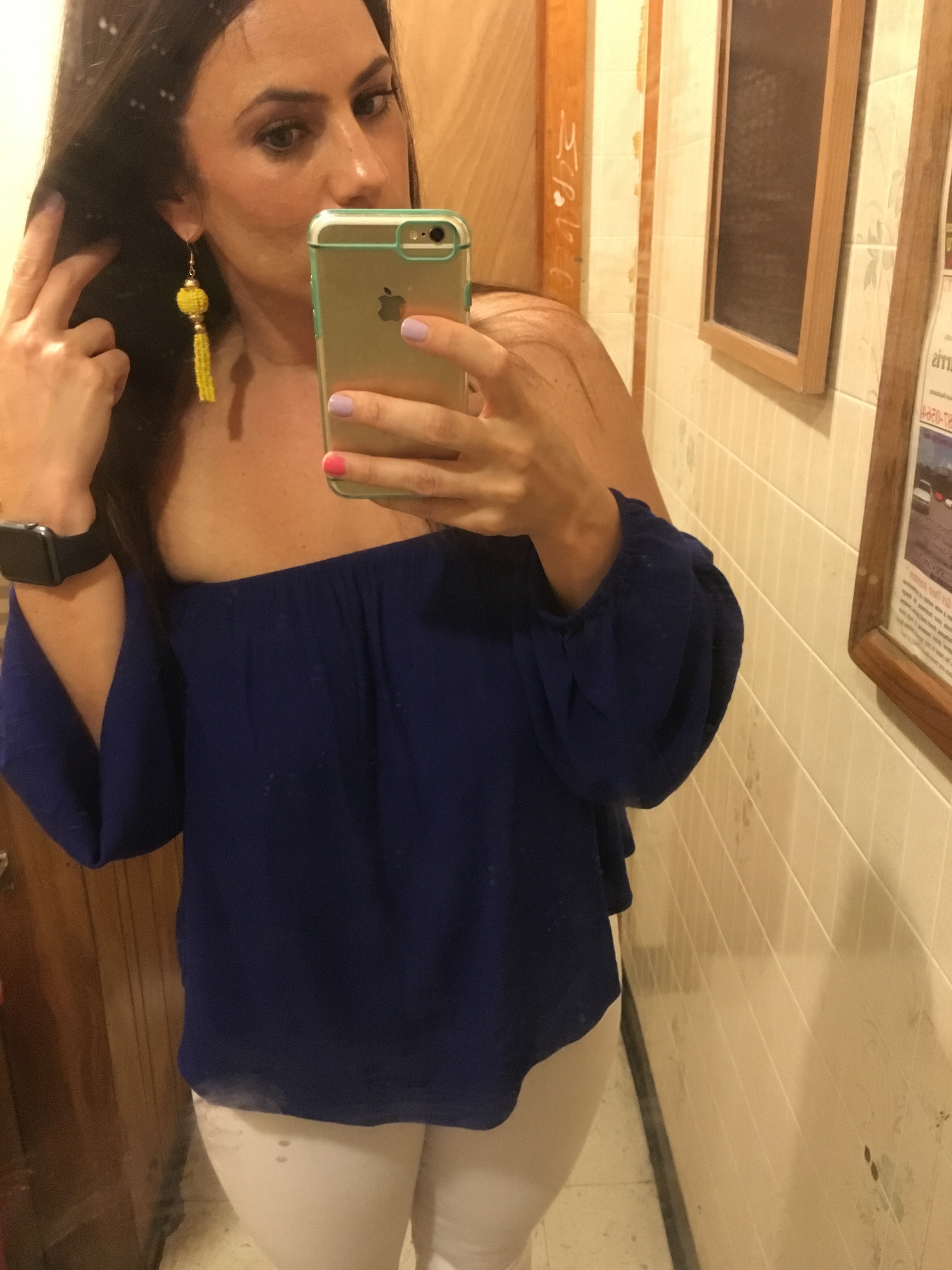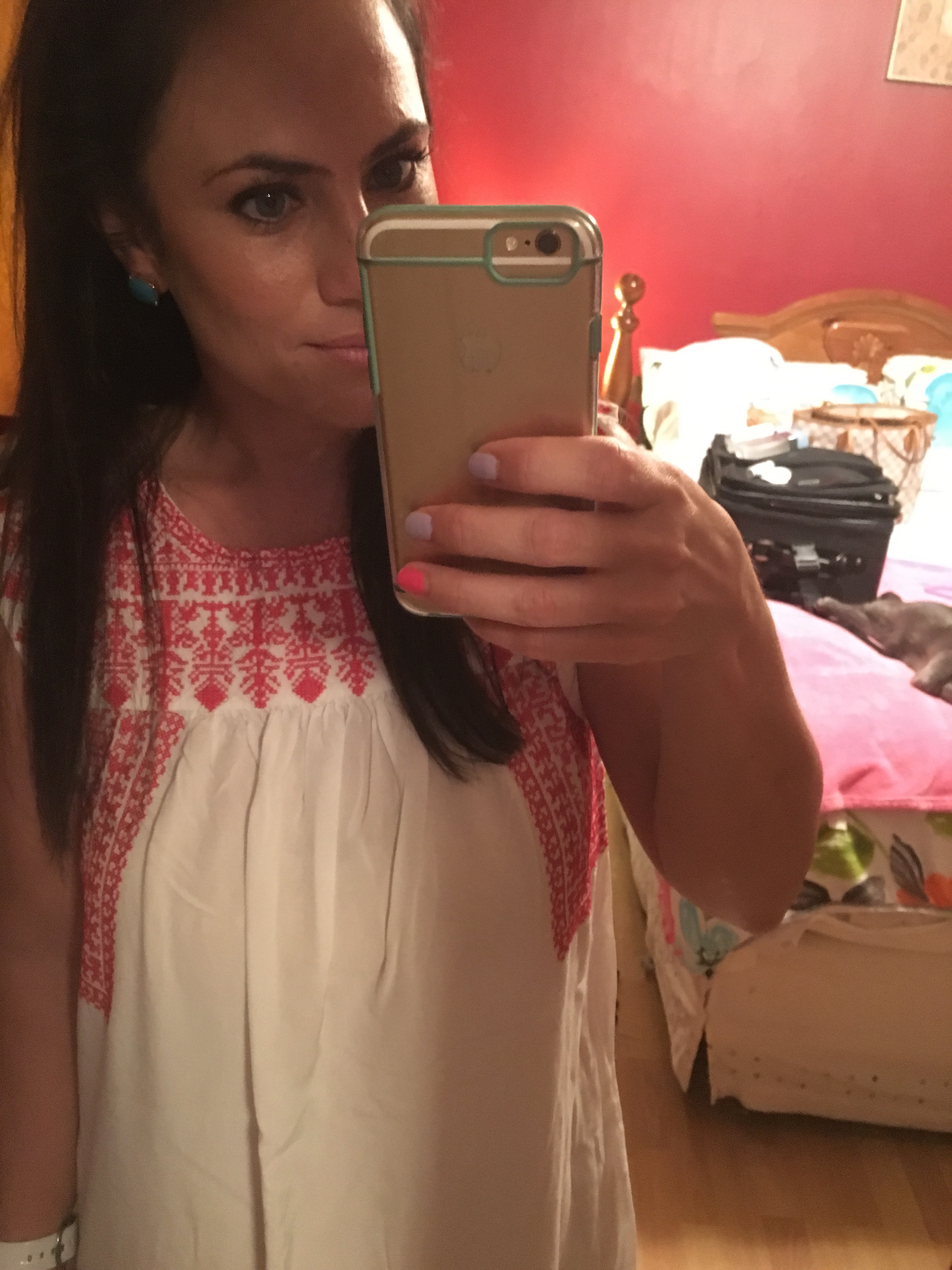 I wore this dress Friday afternoon to head out on a road trip. It’s light and flowy and the embroidery is so pretty. Paired with aqua blue earrings ππΌ