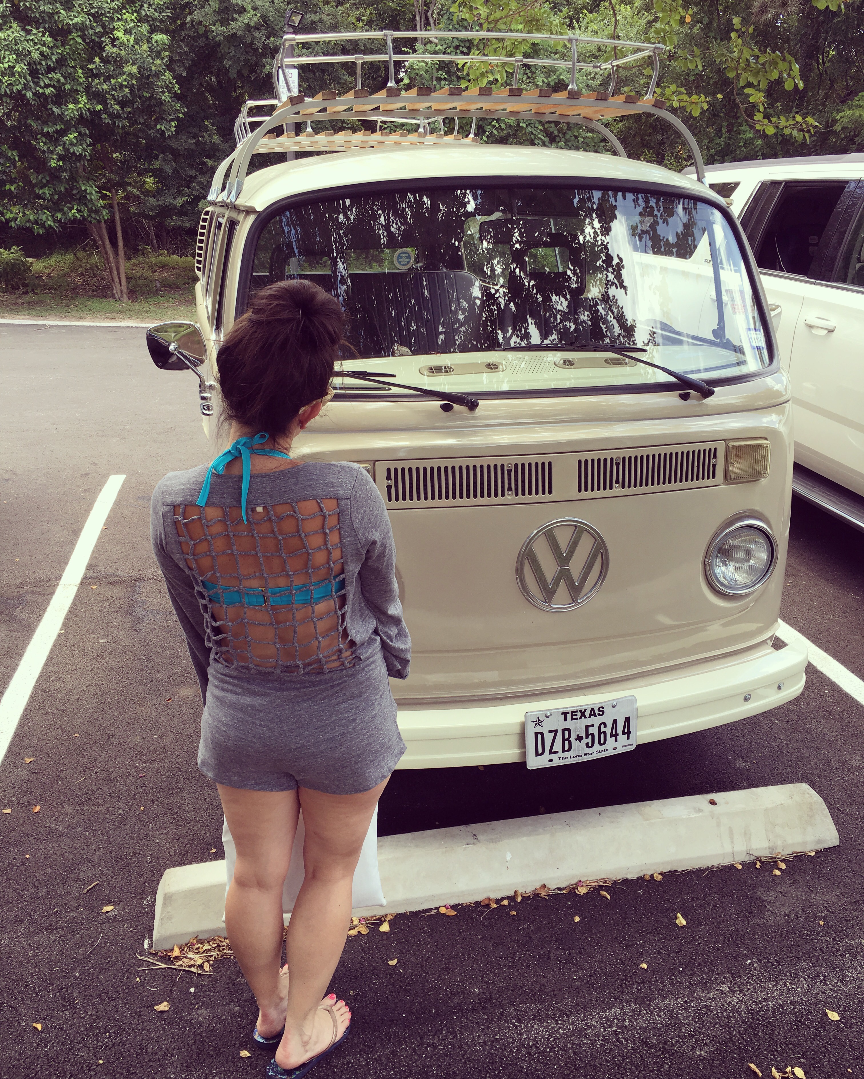 I love this romper and I love this VW! I’m such a sucker for these old VW buses, and also, the old VW Beetle (convertible, of course), and El Caminos. My cousin is already on the hunt for one for me and he’s doing the refurbishing. His work is amazing! ππ» So maybe next summer you’ll see me cruising in my remodeled El Camino or Beetle–top down!